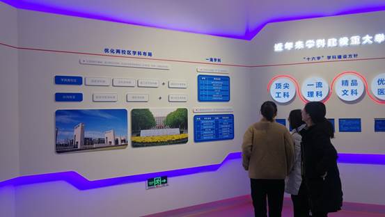 展览以深入学习贯彻习近平新时代中国特色社会主义思想为主线,共分为“团队建设”,“人才培养”,“教师队伍建设”,“科研创新”,“国际交流合作”,“党的建设”等六大板块,通过照片、视频、实物模型等手段集中展示学校近年来各方面工作取得的成绩,以及建设中国特色世界一流大学的决心信心。